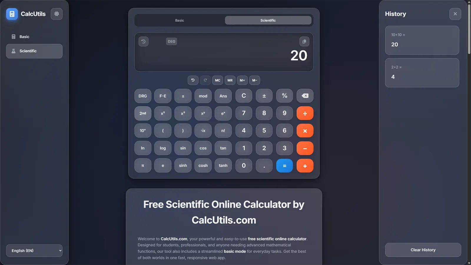Welcome to CalcUtils.com, your powerful and easy-to-use free scientific online calculator. Designed for students, professionals, and anyone needing advanced mathematical functions, our tool also includes a streamlined basic mode for everyday tasks. Get the best of both worlds in one fast, responsive web app.