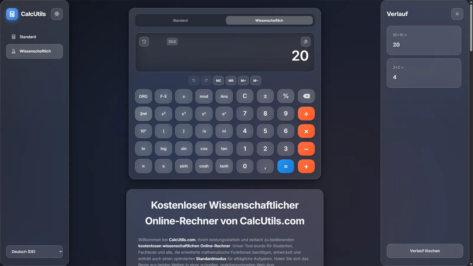 Willkommen bei CalcUtils.com, Ihrem leistungsstarken und einfach zu bedienenden kostenlosen wissenschaftlichen Online-Rechner. Unser Tool wurde für Studenten, Fachleute und alle, die erweiterte mathematische Funktionen benötigen, entwickelt und enthält auch einen optimierten Standardmodus für alltägliche Aufgaben. Holen Sie sich das Beste aus beiden Welten in einer schnellen, reaktionsschnellen Web-App.